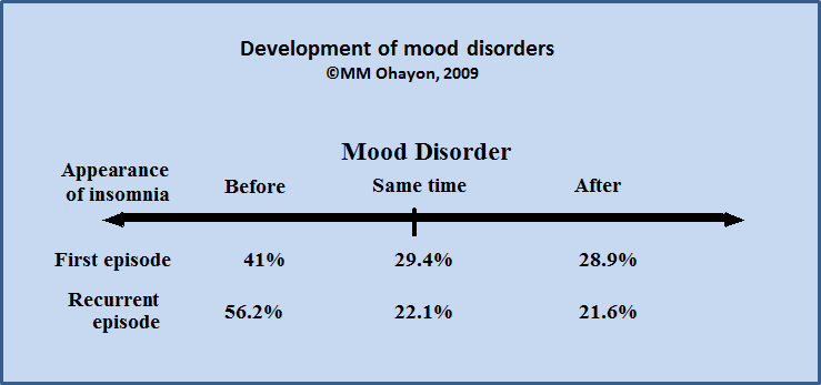 A study (Ohayon and Roth, 2003) examining the time sequence between insomnia and mood and anxiety disorders, reported that insomnia was present in 70% of cases with mood disorders and that it preceded the apparition of the mood disorders in nearly half of cases (figure 2a).